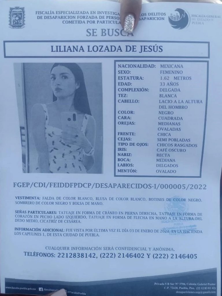 El pasado 3 de enero, Liliana Lozada de Jesús desapareció luego de salir de su domicilio ubicado en el fraccionamiento Hacienda los Capulines, Puebla. Alrededor de las 10 de la mañana, la joven salió de su casa para trasladarse a la ciudad de Atlixco, lugar donde presuntamente asistió para comenzar a laborar como modelo.