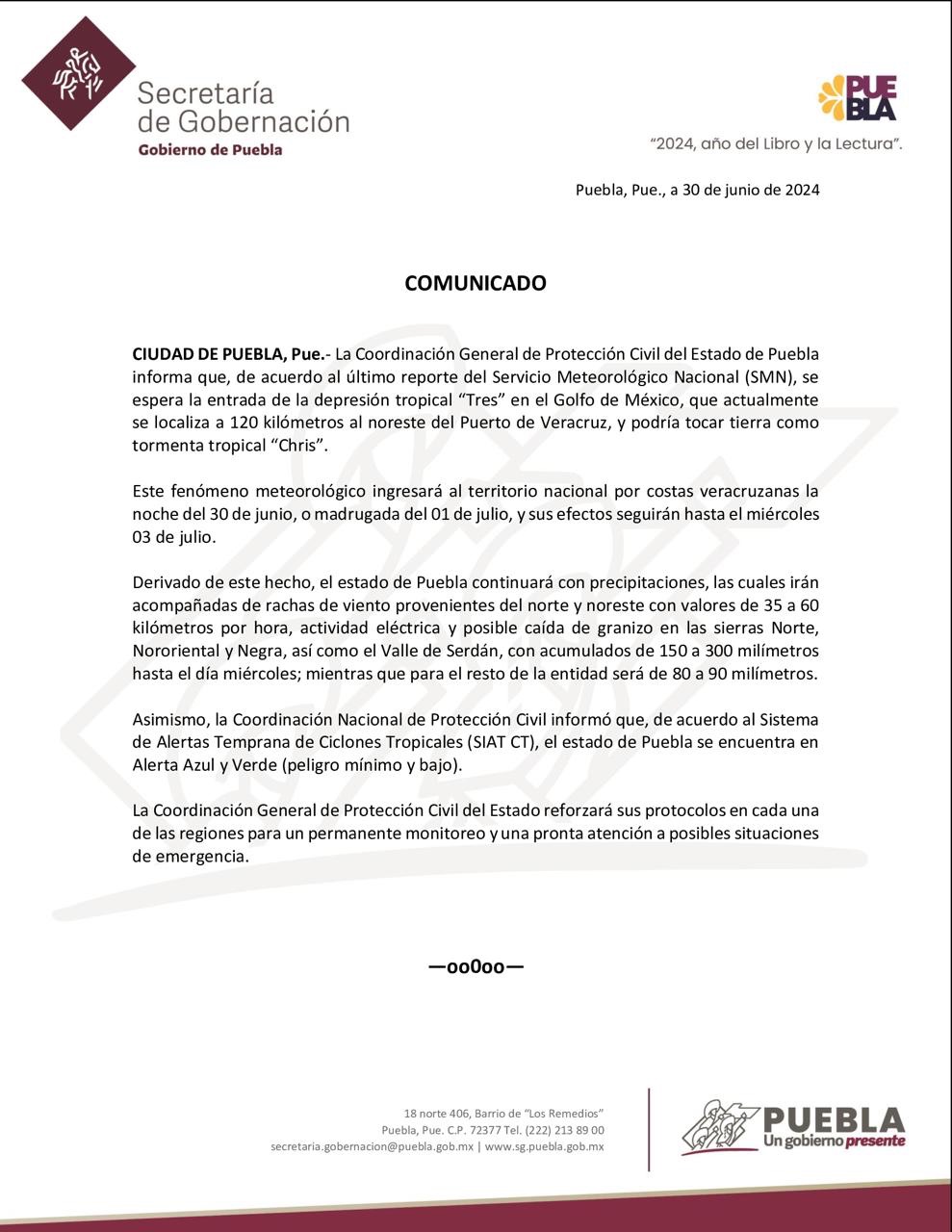 La Coordinación General de Protección Civil del Estado de Puebla ha emitido un comunicado informando sobre la llegada de la depresión tropical «Tres» al Golfo de México, la cual se espera que toque tierra como tormenta tropical «Chris». Según el último reporte del Servicio Meteorológico Nacional (SMN), se pronostica que este fenómeno meteorológico ingrese al territorio nacional a través de las costas veracruzanas durante la noche del 30 de junio o la madrugada del 01 de julio, y sus efectos se extenderán hasta el miércoles 03 de julio.
