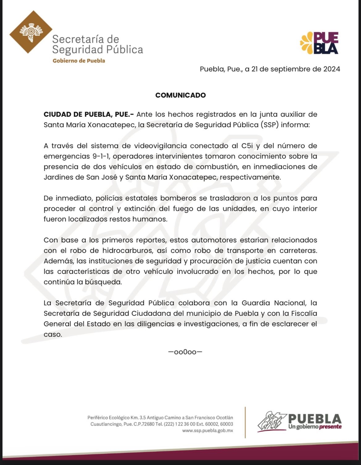 Casi al amanecer de este sábado 21 de septiembre peritos de la Fiscalía General del Estado de Puebla se hicieron cargo de las diligencias correspondientes para el levantamiento de los cadáveres, quienes permanecen en calidad de desconocidos.