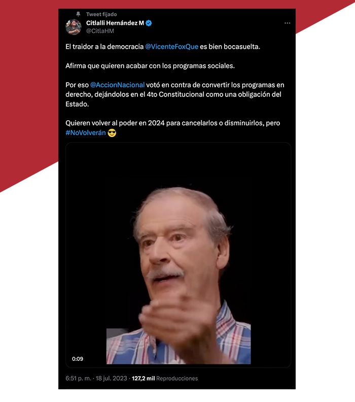 Citlalli Hernández, secretaria general de Morena, reaccionó a los señalamientos de Fox sobre los programas sociales implementados por la actual administración y a través de un mensaje en Twitter se refirió al expresidente como un “bocasuelta”.