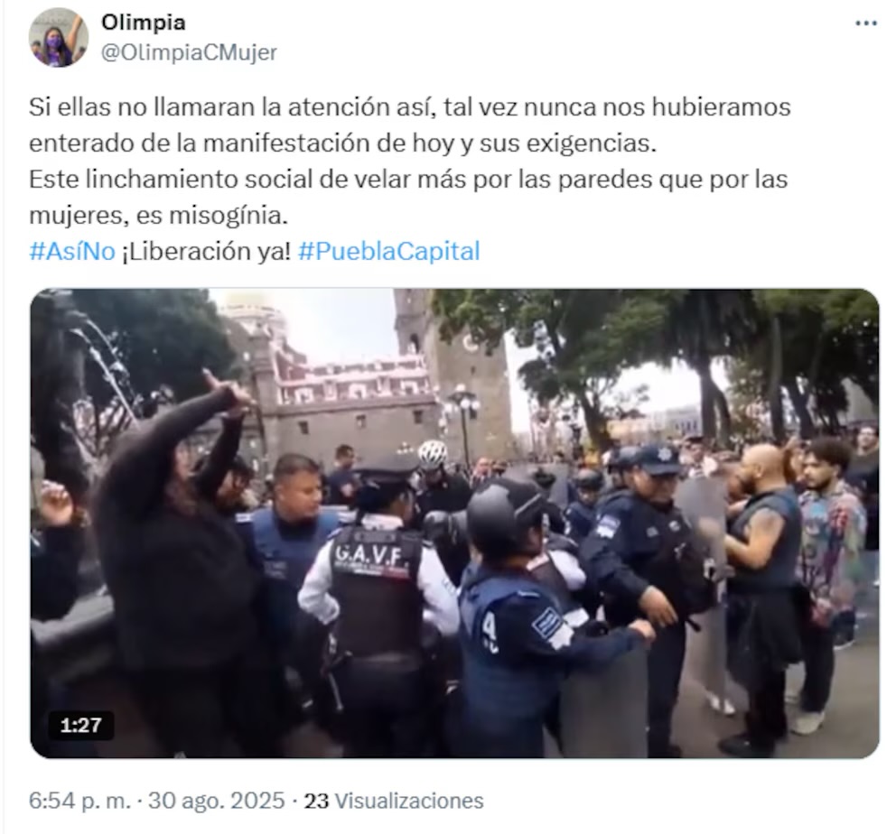 Puebla, Pue. – Durante la marcha del 30 de agosto por el Día Internacional de las Víctimas de Desapariciones Forzadas, manifestantes causaron daños en la fuente de San Miguel del Zócalo de Puebla. La movilización, convocada por el colectivo Morras Sororas Histéricas e Históricas, inició frente a la Fiscalía estatal y concluyó con enfrentamientos que derivaron en la detención de tres mujeres.