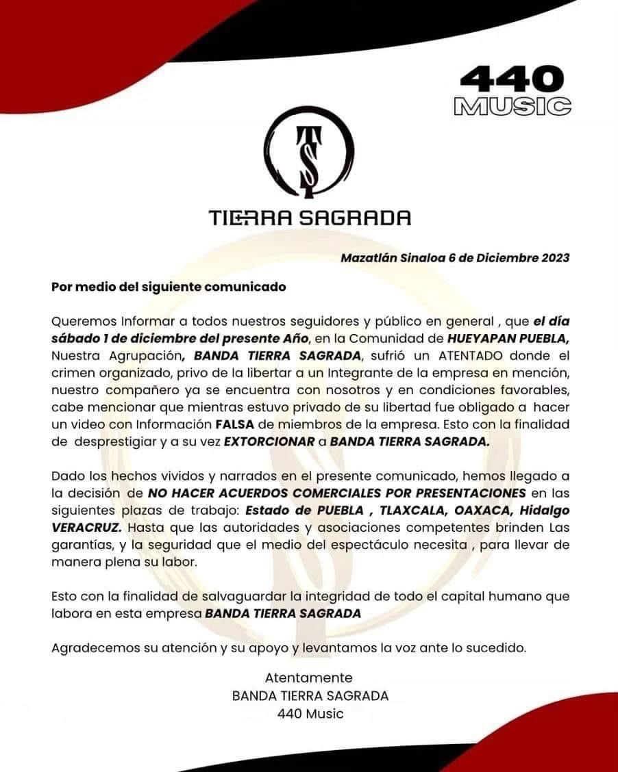 El pasado viernes 1 de diciembre, en el municipio de Hueyapan, se llevó a cabo un baile de feria, en honor a San Andrés Apóstol. En este evento estaría presente la Banda Tierra Sagrada; sin embargo al término de su presentación fueron víctimas de la delincuencia organizada, según explica en un vídeo publicado a través de sus redes sociales, en el que indica que entre los límites de Puebla y Veracruz, donde fue privado de la libertad un integrante de esta banda.