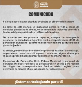 De acuerdo con reportes oficiales, el hombre identificado como Jhonatan “N”, de 43 años de edad y vecino del barrio del Fresnillo, fue sorprendido por las abejas que, presuntamente, ingresaron a su casco mientras conducía, provocándole múltiples picaduras. La reacción habría derivado en un infarto fulminante.