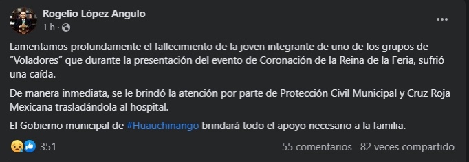El presidente municipal de Huachinango, Rogelio López Angulo, también compartió un mensaje en su cuenta de Facebook para confirmar que la joven pertenecía a uno de los grupos de ‘Voladores’.