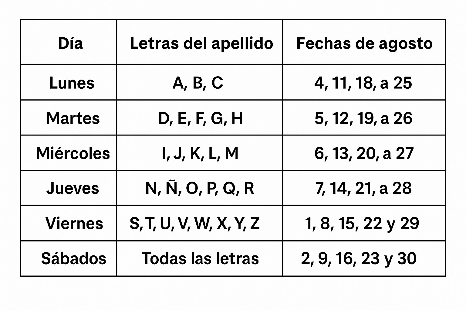 El proceso se realizará del 1 al 30 de agosto, de lunes a sábado, en módulos distribuidos en todo el país, según la primera letra del primer apellido. El horario de atención será de 10:00 a 16:00 horas.