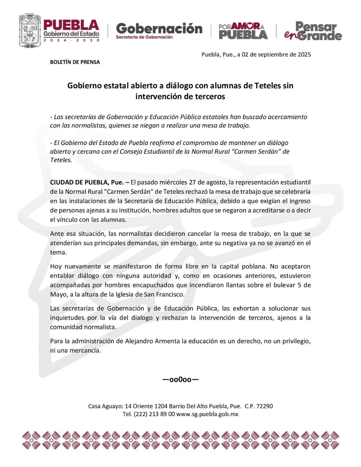 El gobierno reiteró su disposición a atender las inquietudes de la Normal Rural “Carmen Serdán” por la vía institucional y rechazó la intervención de terceros. Asimismo, subrayó que para la administración de Alejandro Armenta “la educación es un derecho, no un privilegio, ni una mercancía”.