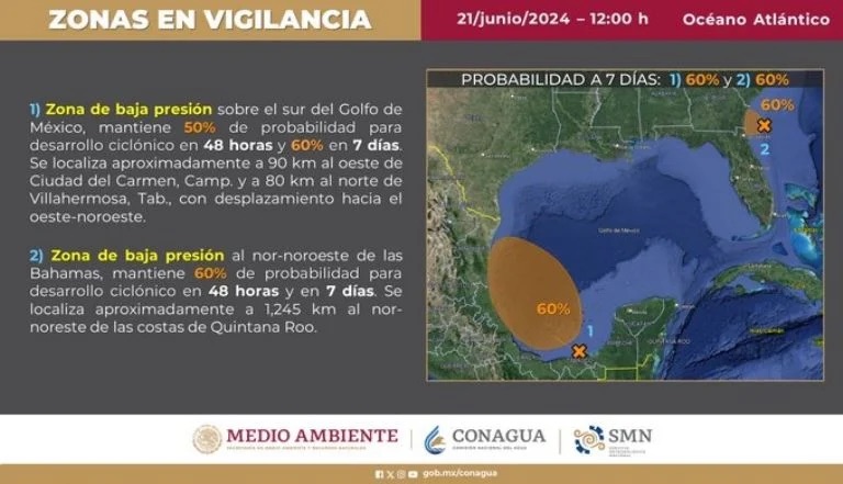 «Existe una zona de baja presión sobre el sur del Golfo de México que mantiene 50% de probabilidad para un desarrollo ciclónico en 48 horas y 60% en 7 días».