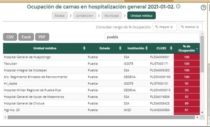 El Hospital General de Zona número 23, ubicado en el municipio de Teziutlán, presenta una saturación del 100 por ciento en la ocupación de sus camas de hospitalización general, reveló al Sistema de información de la Red de Infección Respiratoria Aguda Grave (IRAG) de la Secretaría de Salud federal.