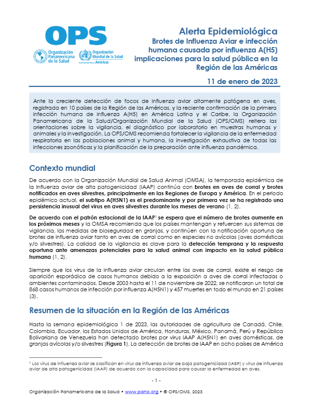 En su actualización epidemiológica sobre brotes de Influenza Aviar del 11 de enero de 2023, la OPS detalló que hasta la semana epidemiológica 1 de 2023, las autoridades de agricultura de Canadá, Chile, Colombia, Ecuador, los Estados Unidos de América, Honduras, México, Panamá, Perú y República Bolivariana de Venezuela han detectado brotes por virus IAAP A(H5N1) en aves domésticas, de granjas avícolas y/o silvestres.