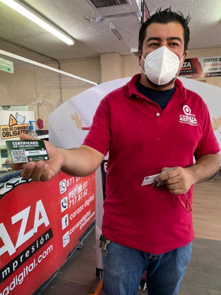 Eduardo Ramírez encargado de una tienda de impresiones en Torreón ante la necesidad que tienen las personas de mostrar y confirmar que ya cuentan con la aplicación de su vacuna y que en algunos lados como el aeropuerto o para cruzar la frontera de México con Estados Unidos es obligatorio presentar su certificado de vacunación, le surgió la idea de realizarlo en forma de credencial, para que las personas puedan traerlo a todos lados.