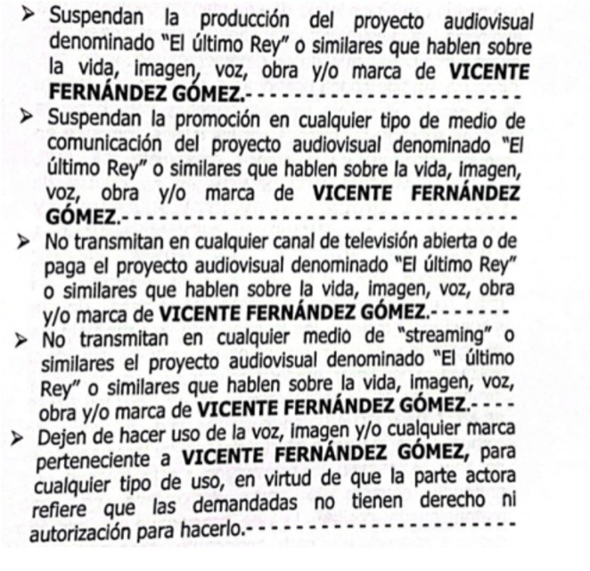 De acuerdo con un fragmento, compartido por Del Toro Carazo, de lo estipulado por el Juez 10º Civil en el expediente 177/2022, la empresa deberá suspender la promoción en cualquier medio de comunicación del proyecto audiovisual denominado “El Último Rey” o similares que hablen sobre la vida, imagen, voz, obra y/o marca del cantante fallecido el pasado 12 de diciembre.