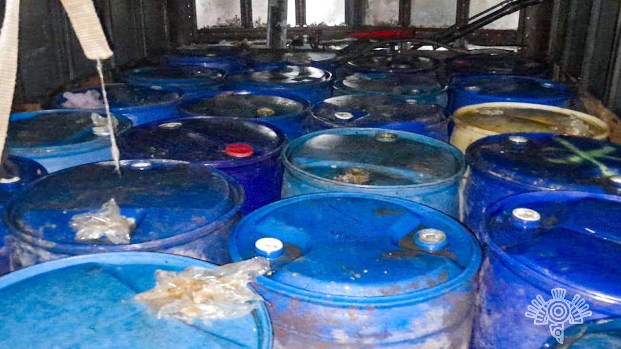 Al revisar el interior de la unidad, fueron localizados 23 recipientes de plástico que, en su conjunto, almacenaban alrededor de 3 mil 600 litros de combustible.