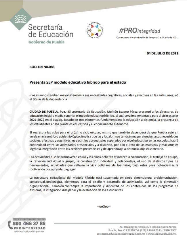 La SEP presentó a los directores de educación inicial a media superior el modelo educativo híbrido, que contempla un regreso a las clases de manera semipresencial para el ciclo escolar 2021-2022 en Puebla.
