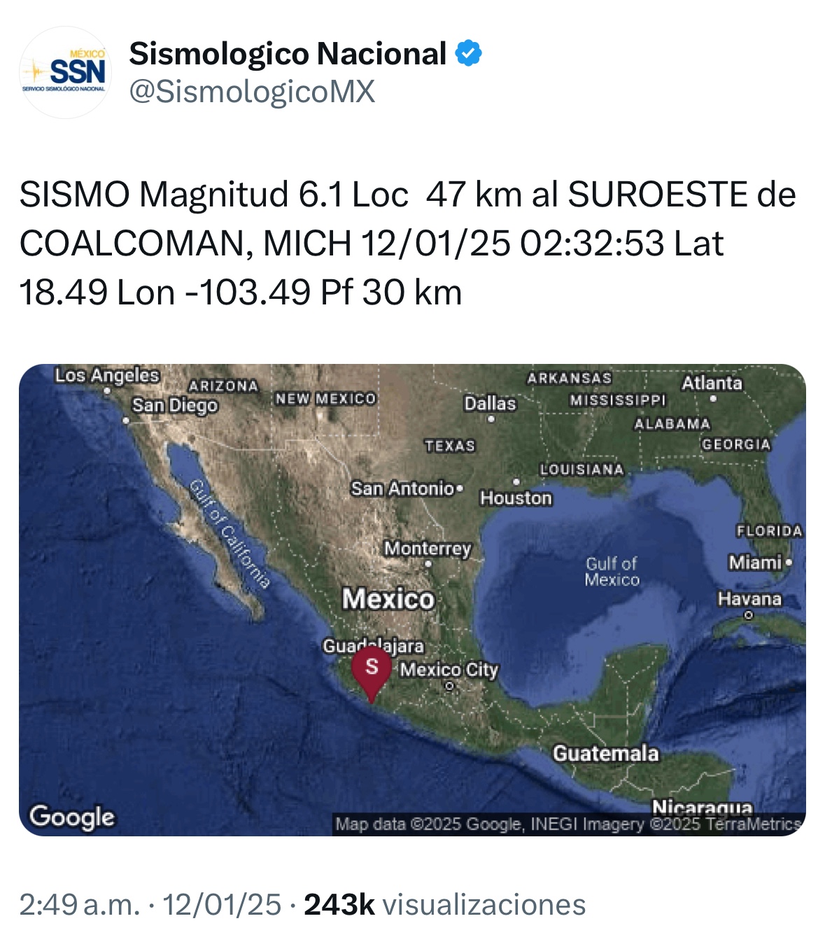 Según el Servicio Sismológico Nacional, el epicentro del sismo se ubicó a 47 kilómetros al suroeste de Coalcomán, Michoacán, a una profundidad de 30 kilómetros.