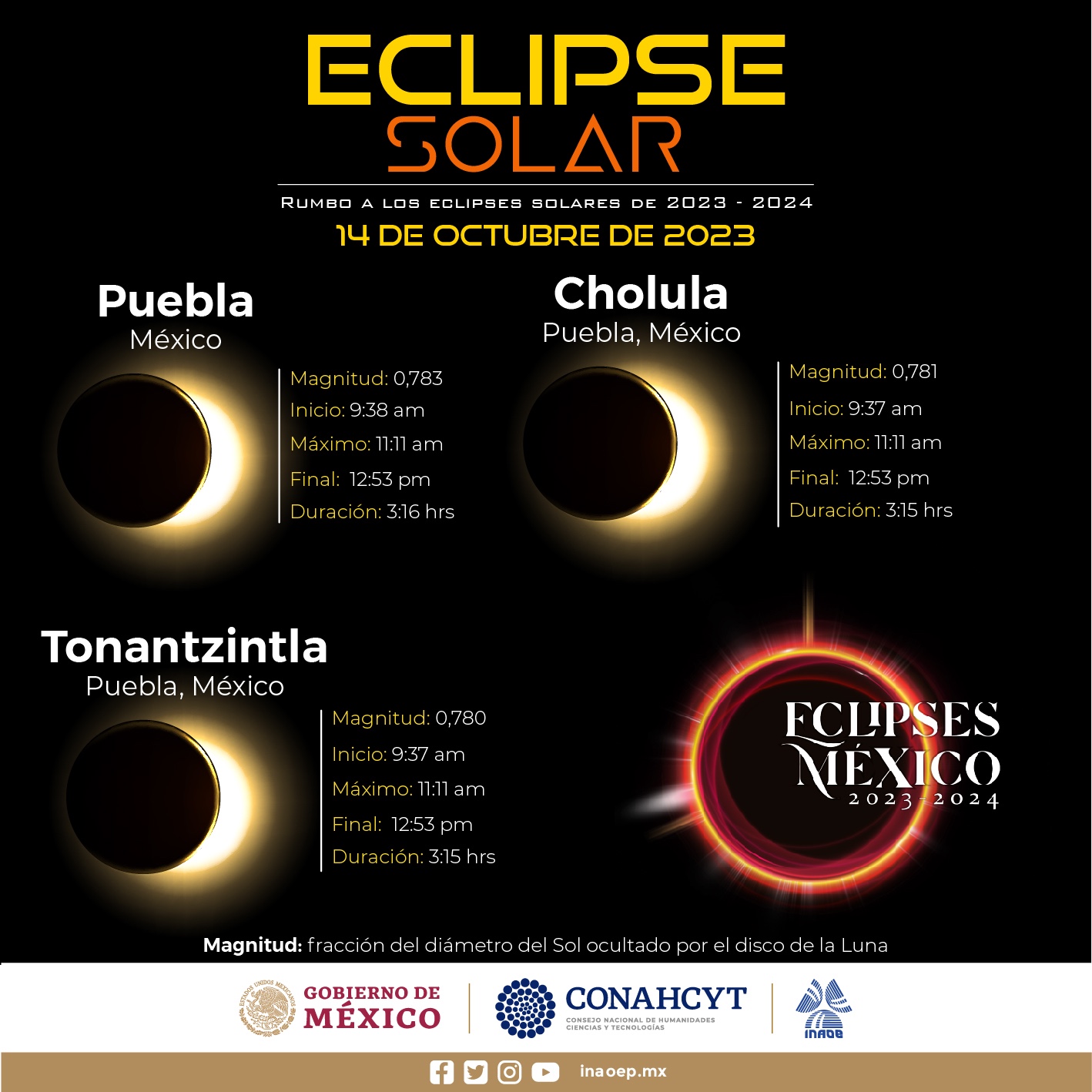 Además, el INAOE destacó que de las 9:00 a las 13:00 horas, en parques, universidades, escuelas, jardines, explanadas, callejones, plazas, bibliotecas y casas de cultura de más de 15 municipios poblanos, las personas interesadas podrán observar este fenómeno astronómico con seguridad, de la mano de astrónomos, profesionales y aficionados, y de divulgadores de la ciencia