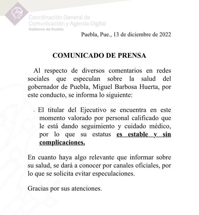 El gobierno de Puebla informó sobre el estado de salud de Miguel Barbosa, el gobernador. Se encuentra bajo supervisión médica, sin embargo su estado de salud es estable y sin complicaciones.