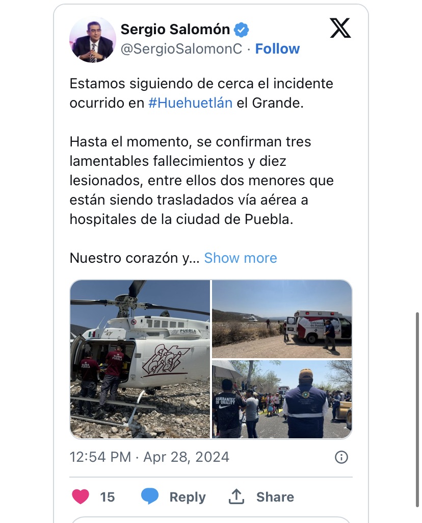 En sus redes sociales el gobernador Sergio Salomón Céspedes informa que el accidente vial en carretera a Huehuetlán dejó saldo de 3 muertos y 10 heridos.
