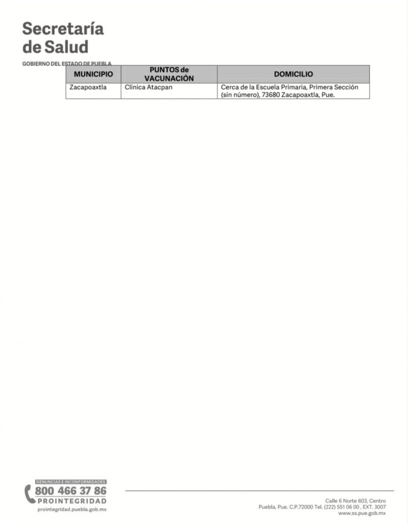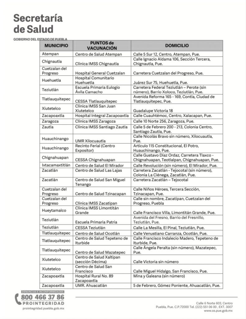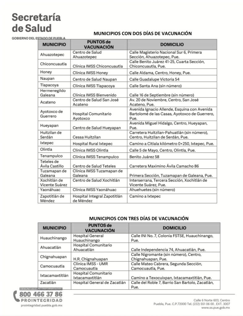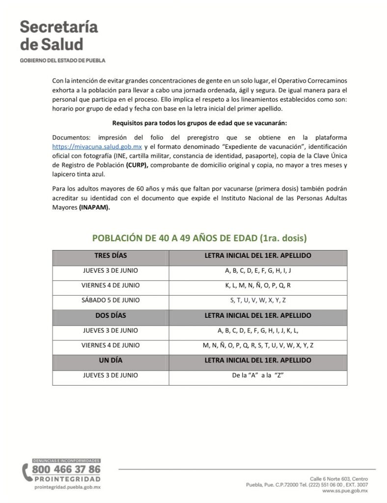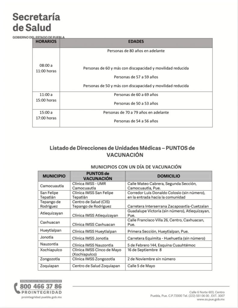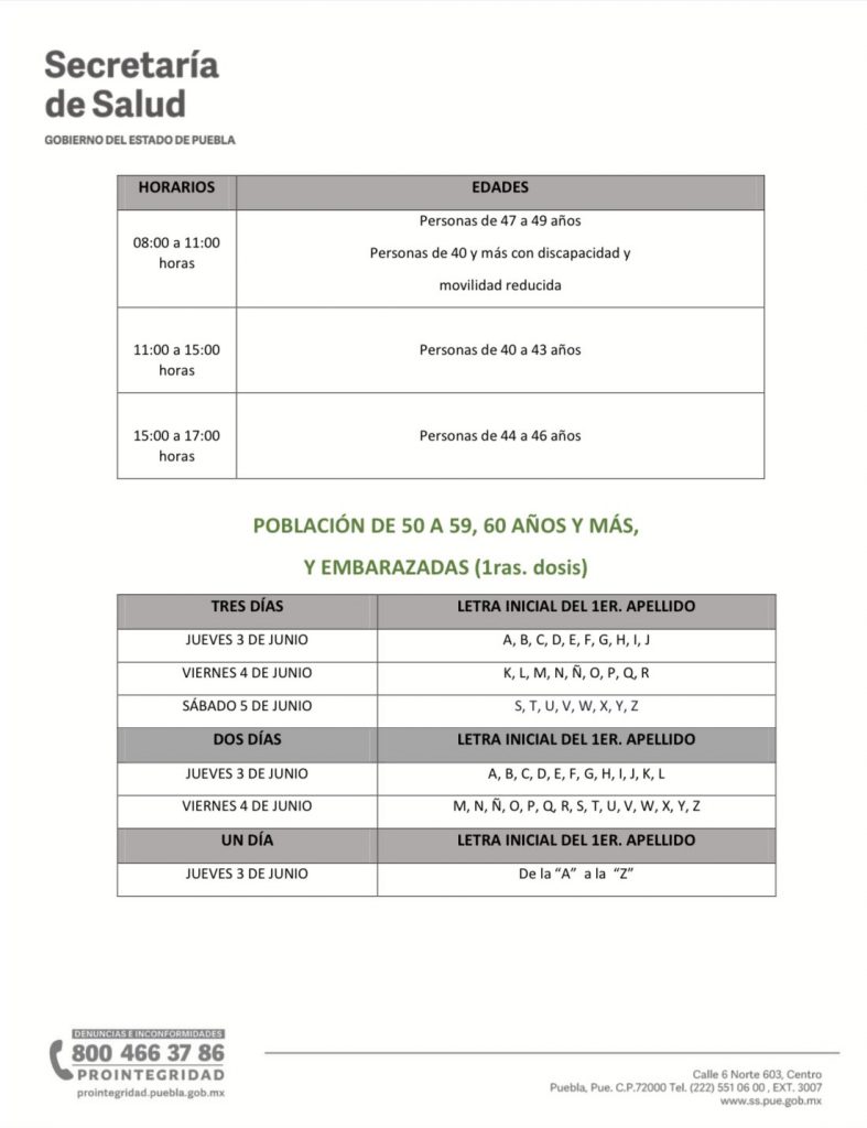 Región Vacunación para mayores de 40 años; estos son los días, horarios y puntos de aplicación Por La Ruleta - junio 1, 2021 ENTÉRATEMás del autor Región Hombre se desploma y pierde la vida en calles de Xiutetelco Poblanas La citó en un hotel de Puebla y la asesinó; pasará 50 años en prisión Poblanas Cobraba rescate por secuestro y terminó detenida; le dan 50 años en Puebla