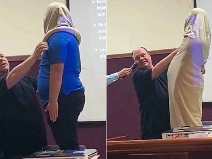 De pronto, el catedrático sacó lo que parecía una funda blanca y la colocó en la cabeza del estudiante; poco a poco la fue extendiendo hasta cubrir al muchacho, en medio de las risas de sus compañeros; al final, simuló un condón puesto.