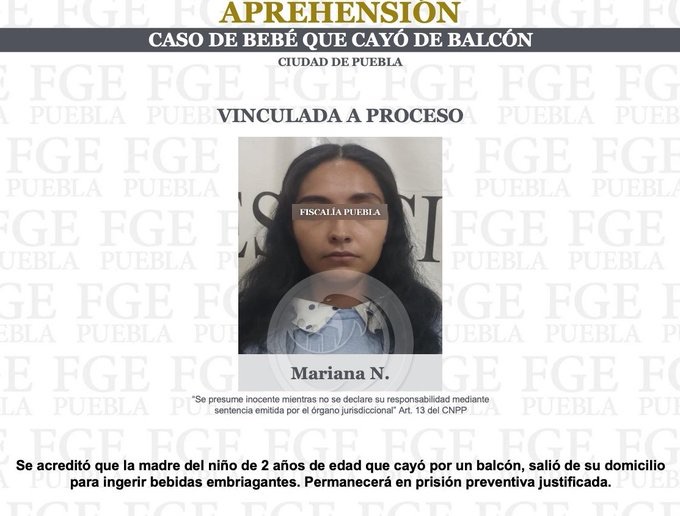 La Fiscalía General del Estado de Puebla detuvo y vinculó a proceso a una mujer que dejó solo su hijo de 2 años de edad y que en ese tiempo el menor cayó del balcón de la casa donde vivía, ubicado en La Paz.