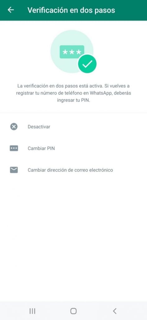 Para terminar, se debe dar clic en la opción “Siguiente” y “Guardar”. En caso de que se quiera desactivar, esta alternativa siempre está disponible y para acceder a ella se deben seguir los mismos pasos, aunque en esta ocasión aparecerá “Desactivar” junto a “Cambiar PIN” o “Cambiar correo electrónico”.