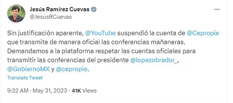 A ello aseguró que la suspensión se efectuó “sin justificación aparente”. Por lo cual hizo un exhorto a la plataforma a “respetar las cuentas oficiales” que facilitan la transmisión de las tradicionales mañaneras de López Obrador.